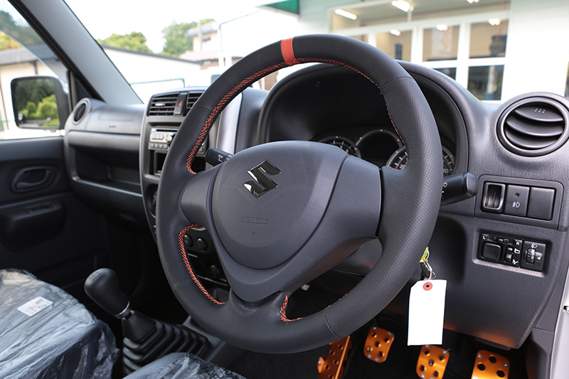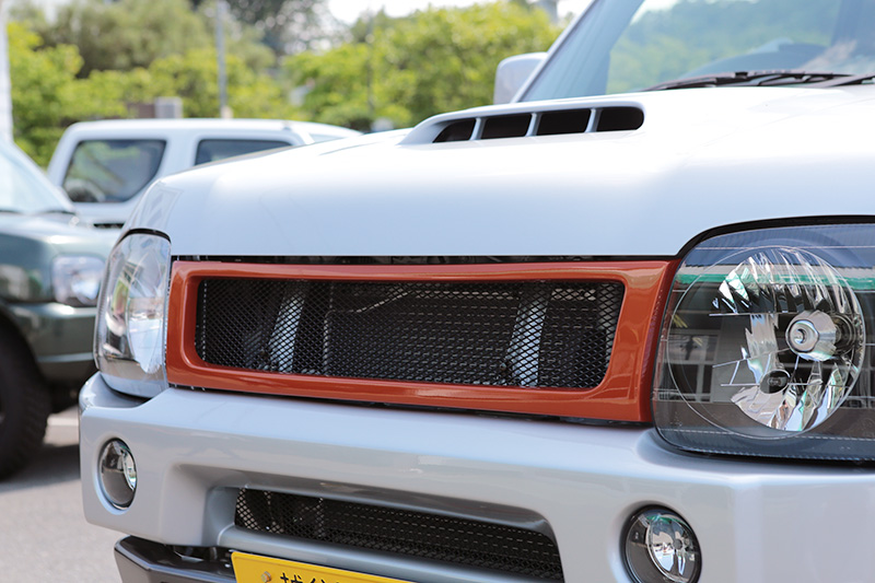 オレンジメタクリックのフロントグリルが格好いいシルバーのアピオジムニーコンプリートカーTS4が納車です。グリルだけでなく、インテリアも差し色にオレンジをチョイス。オーナーの遊び心が効いてます。TS4でご趣味のキャンプ、釣り、MTBをお楽しみ下さい。
