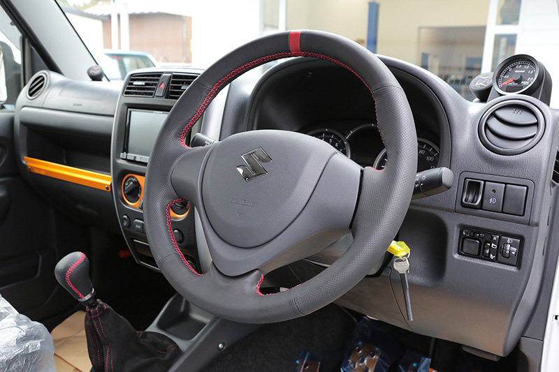 スープアップからガードパーツまでフルコンプリートされたジムニーTS4を納車いたしました。エクステリアはモノトーンでしめ、インテリアにはオレンジの差し色がとても美しいですね。ジムニーでキャンプ、林道ツーリングをお楽しみ下さい。