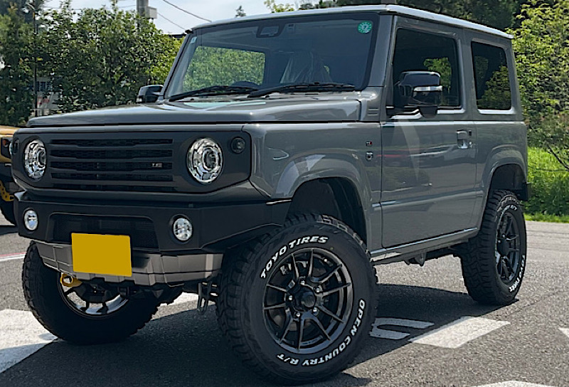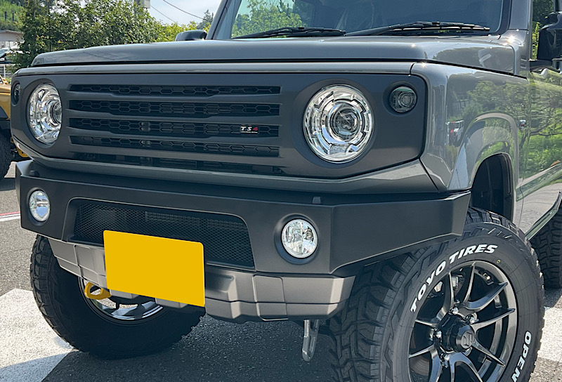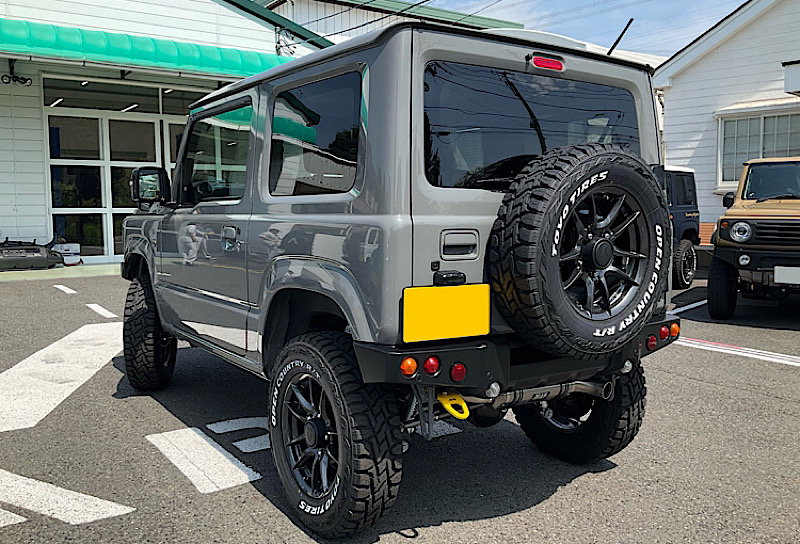YASUさんのジムニーは車高とタイヤのサイズバランスが絶妙です。オープンカントリーRT215/70R16に40mmリフトアップ及び弊社バンパーを組み合わせました。