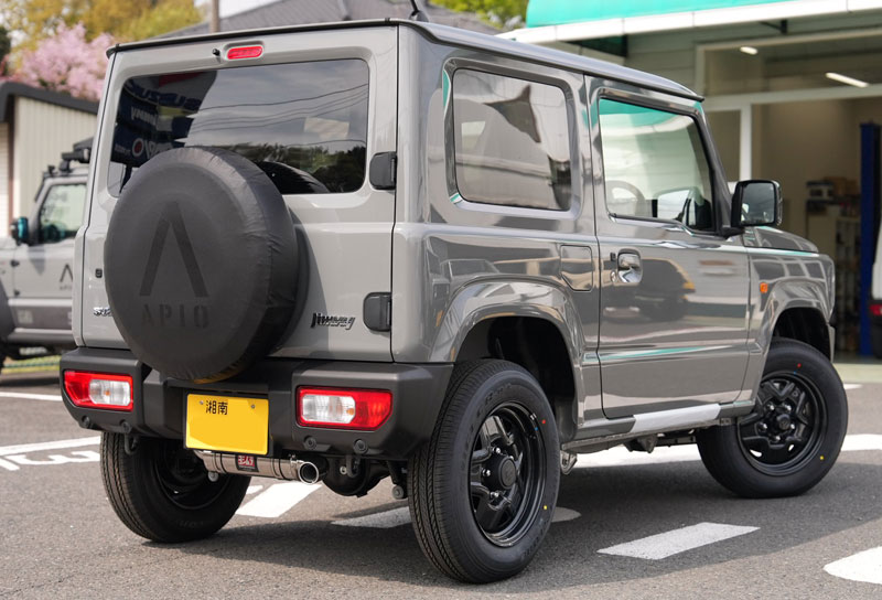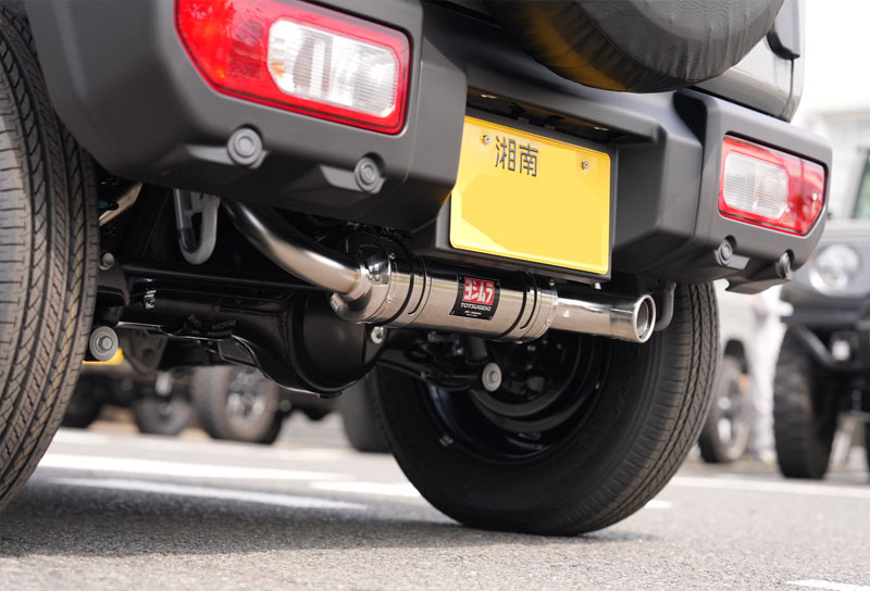 マルさんのジムニーはあえてコンプリートカーとせず、アピオの中でも特にスペシャルなパーツである「ヨシムラマフラーステンレスサイクロン」を装着させて頂きました。