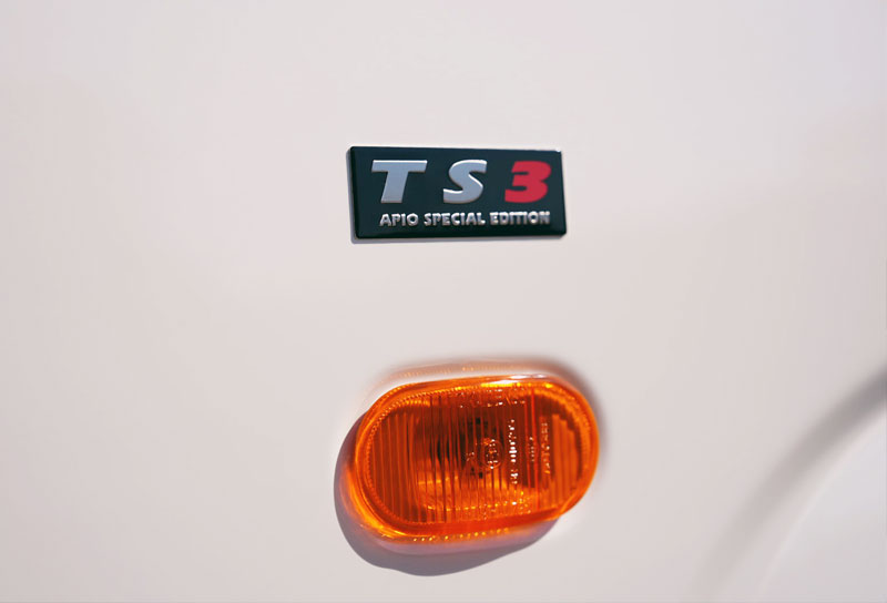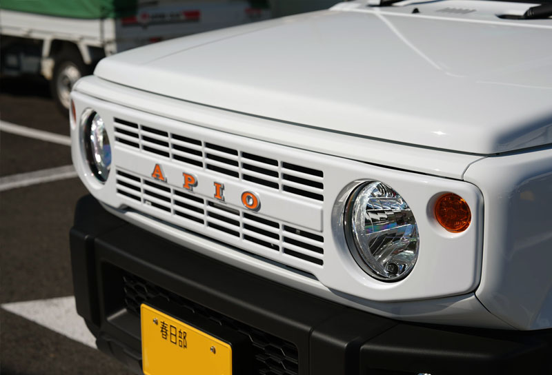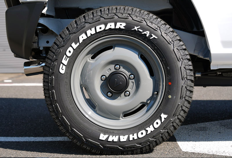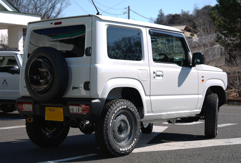 クニさんのジムニーはホワイトのXLグレードをベースにTS3仕様をご選択いただきました。こだわりのポイントはフロントグリル!通常はブラックのビンテージアイアングリルをボディ色塗装とし、グリルとボディの一体感を出すことですることで、レトロな雰囲気を醸し出しています。また、グリル中央にはAPIOエンブレムをご選択いただき、オレンジ色のロゴがワンポイントでおしゃれですね。また、タイヤは割と最近、しれっとラインナップに追加されたヨコハマタイヤ ジオランダーX-ATの185/85R16サイズをチョイス。ベタ塗りのホワイトレターはライバルのOPEN COUNTRY R/T185/85R16と同様となり、さらに重量が1㎏ほど軽量なことから、軽量化を追求される方には、今イチ押しのタイヤとなっております。
