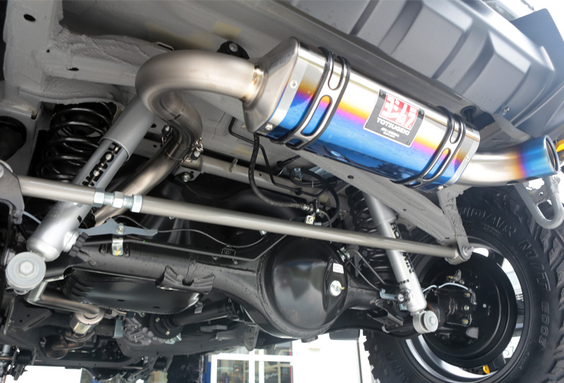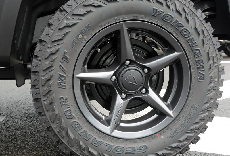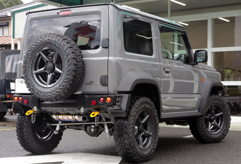 はちべーさんのシエラはLINE-Xを施したしし狩りバンパーに16インチの大径&ワイドな225サイズのジオランダーMTとX2ホイールの組み合わせが迫力満点の仕上がりです。ヨシムラチタンマフラーの青が後ろ姿を引き締めてくれます。