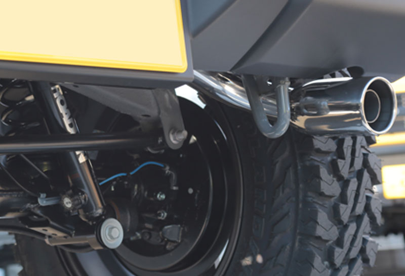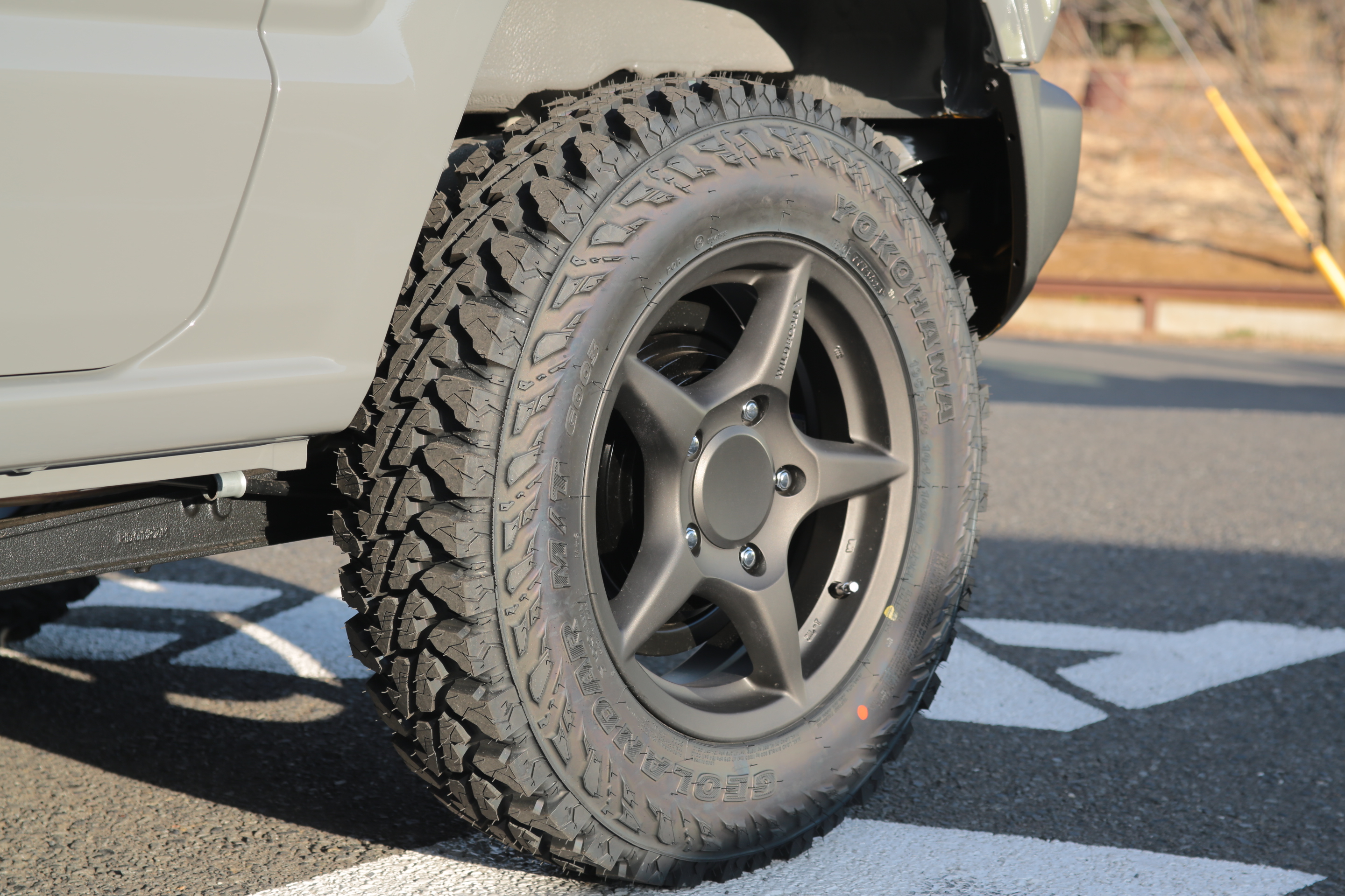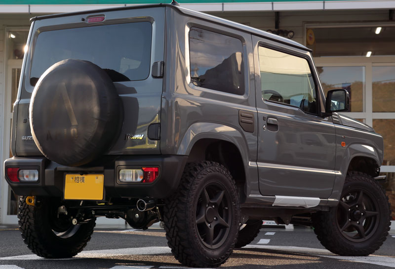 オオブチさんのジムニーはXLグレードのクールなミディアムグレーのボディカラーにワイルドボアⅹガンブラック色のホイールにヨコハマジオランダーのマッドテレーンタイヤ195R16の組み合わせで「絶妙なバランス」がカッコよく渋い一台となりました。