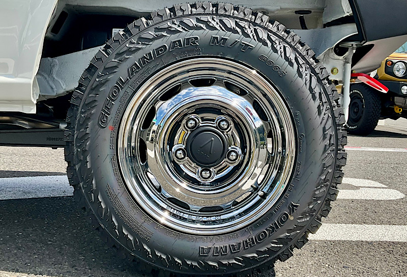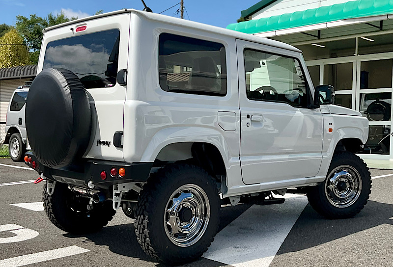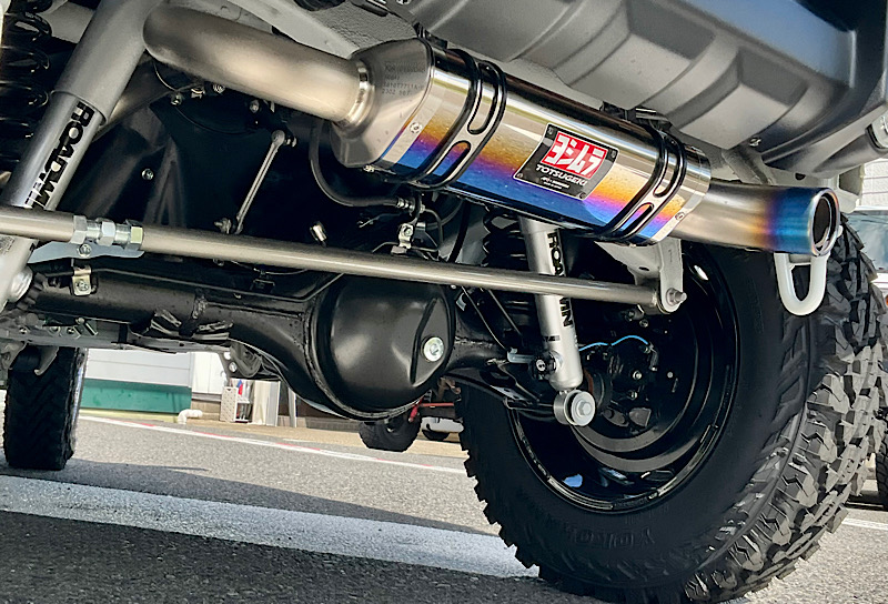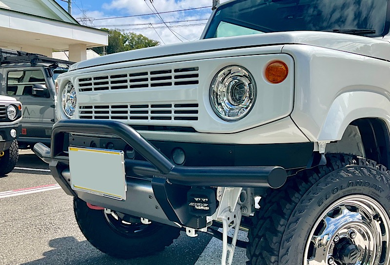 ツッチーさんのジムニーはパールホワイトのボディカラーにワイルドボアVenturaクローム&ジオランダーMT185/85R16、フロントはオプションのボディ同色塗装を施したビンテージアイアングリルを装備。しし狩りバンパーの無骨感も相まって、ネオクラシックな雰囲気をまとっております。また、ヨシムラのチタンサイクロンマフラーチタンブルーも採用頂いており、どこから見ても美しい一台に仕上がっております。