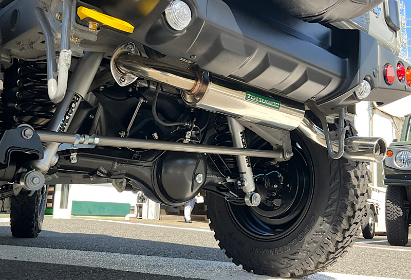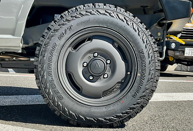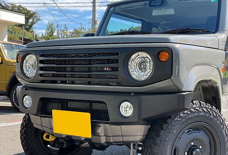 はまださんのジムニーはミディアムグレーのボディカラーにワイルドボアSR&ジオランダーMT185/85R16、フロントはタクティカルフロントグリルを装備。また、忘れがちですがフォグランプバルブは標準ですとハロゲンバルブのところ、二色切り替え式のIPF製LEDフォグランプバルブに交換済みです。ベーシックなスタイルで、まとまりの良い一台に仕上がっております。