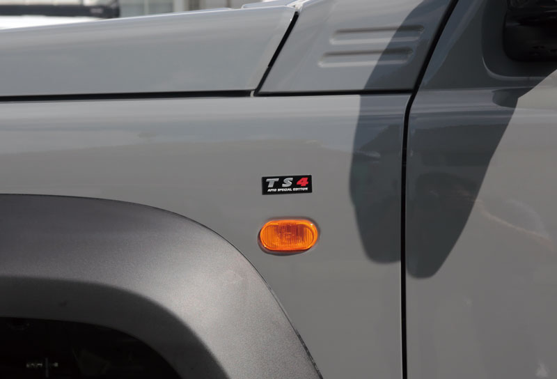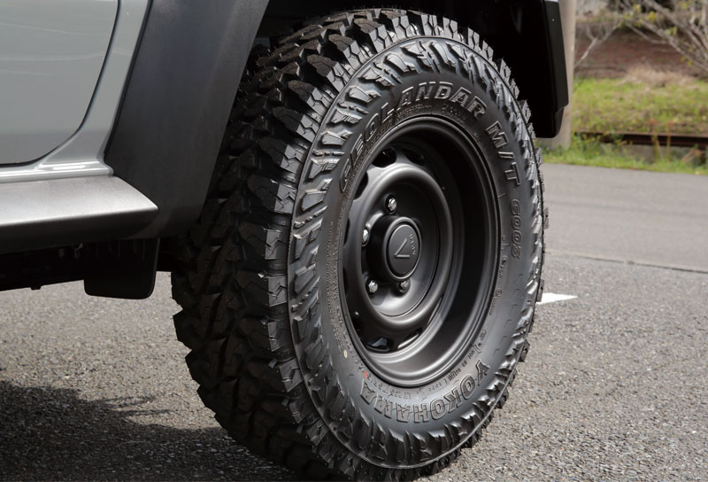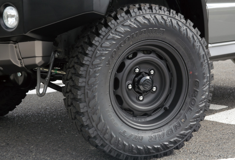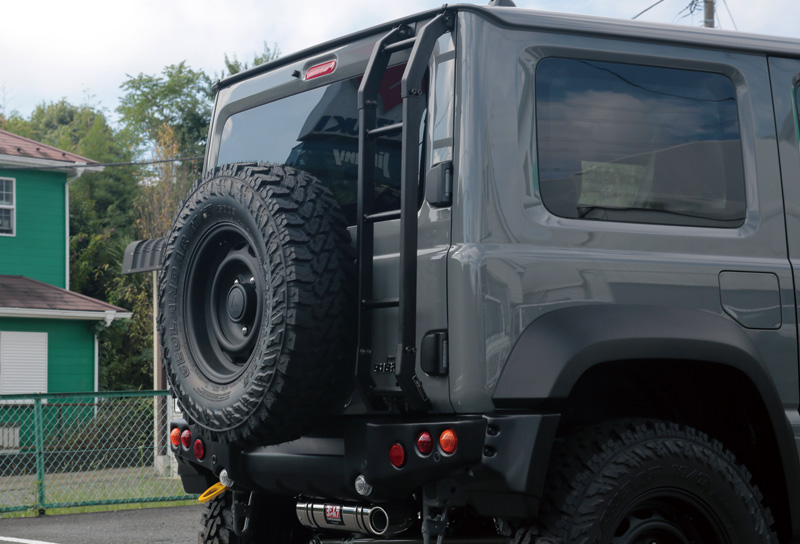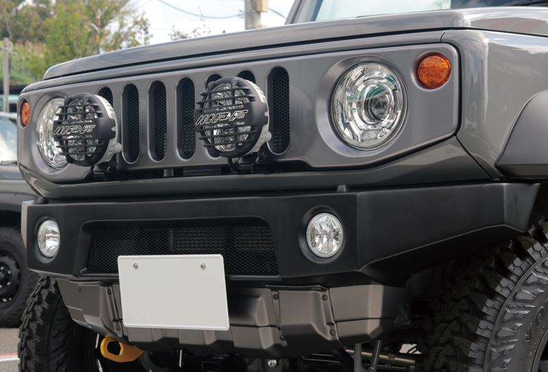 セルジオ石井さんのジムニーシエラはミディアムグレーのボディカラーにSJグリルとIPFの丸形LEDランプ、そして足元にはワイルドボアベンチュラに235/75R15サイズのジオランダーMT。