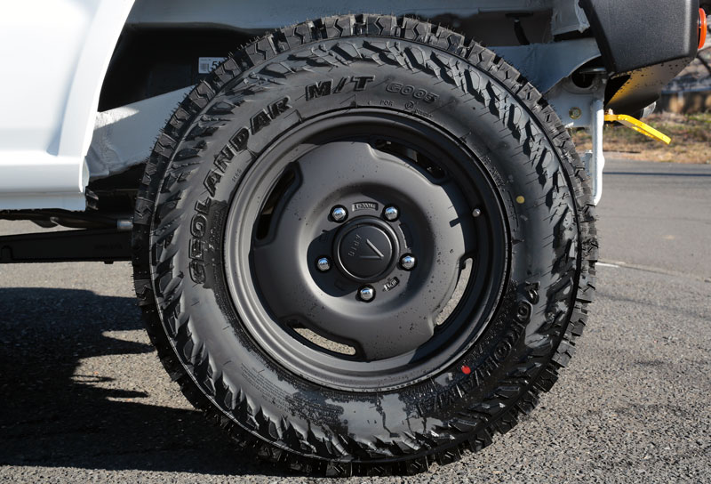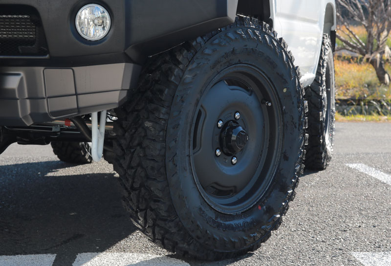 ジノサリさんのジムニーは凛々しいホワイトのXLグレードをベースに205サイズのジオランダーMTでより逞しい外観となっております。