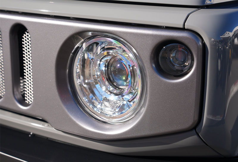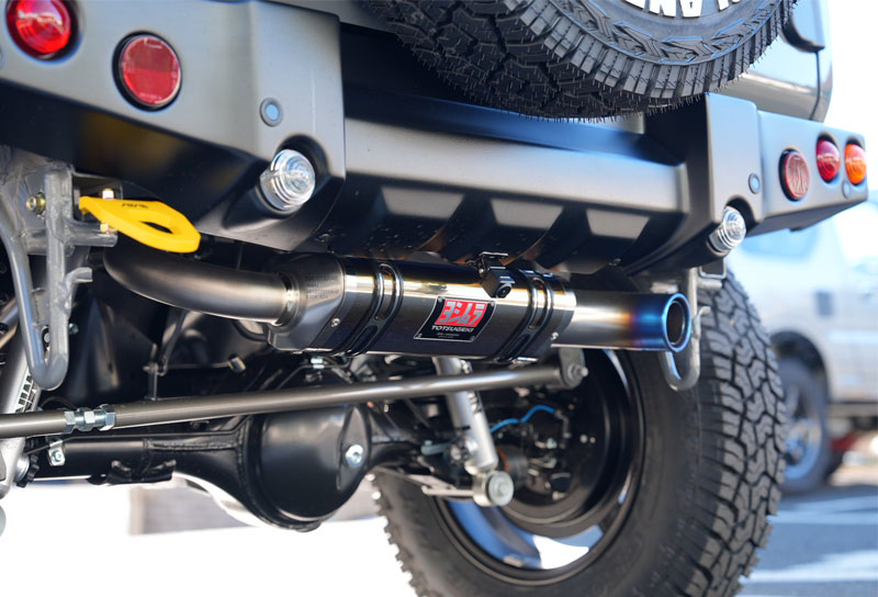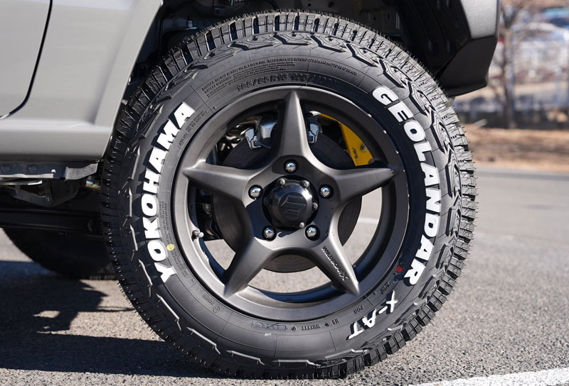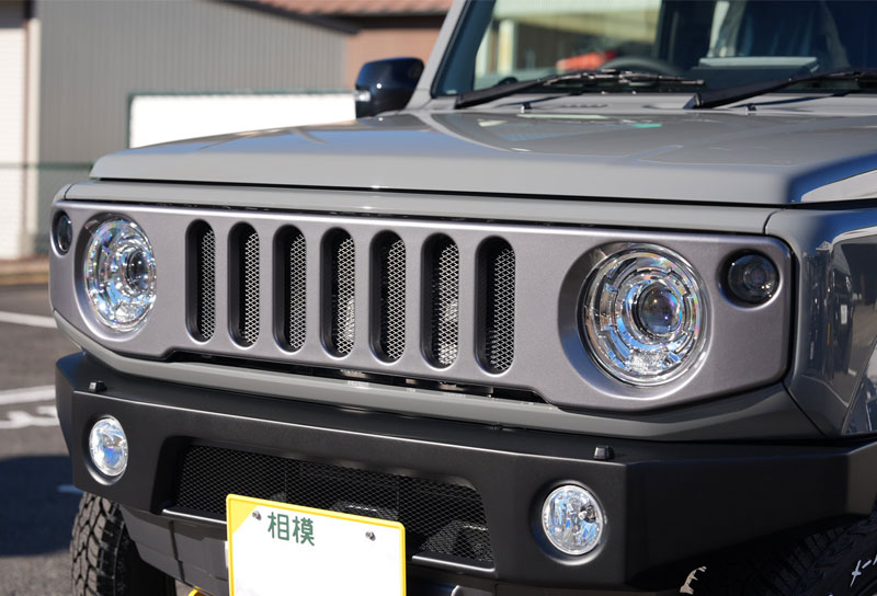 のぶさんのジムニーはミディアムグレーのXCグレードをベースに前後タクティカルバンパーを採用&フロントグリルにはSJグリルガンメタリックを装備。