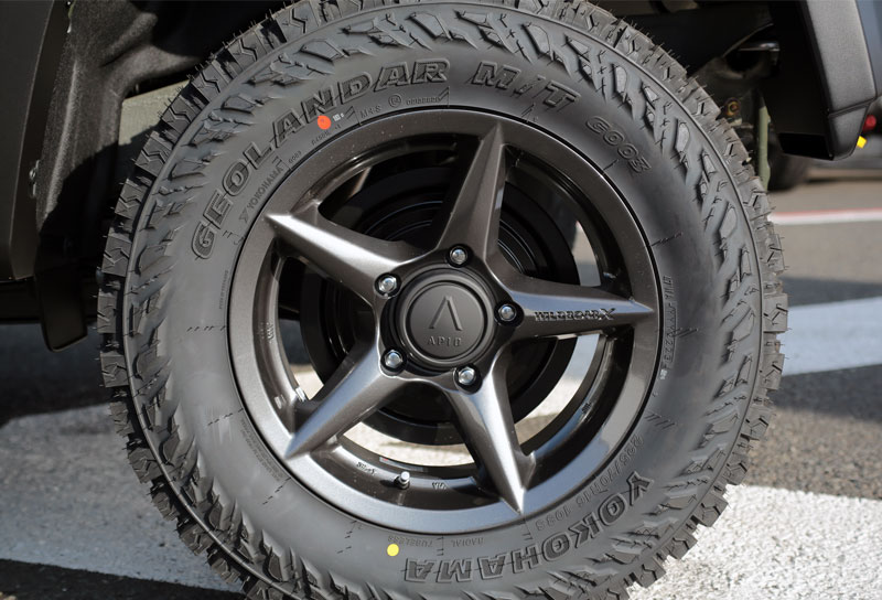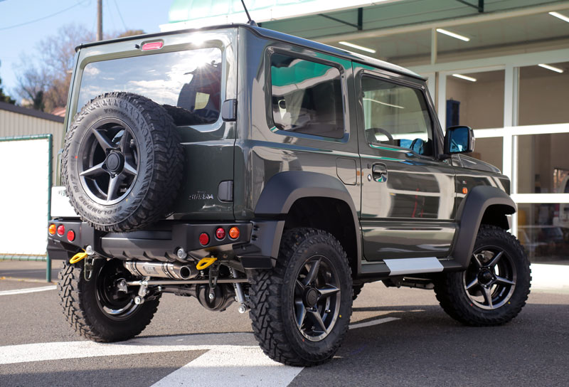 H.Sさんのジムニーは、ジャングルグリーンの車体色で落ち着いた雰囲気がありながらも、新発売のワイルドボアX2を採用することで、足元はスポーティーな印象です。