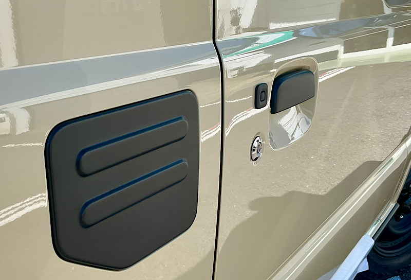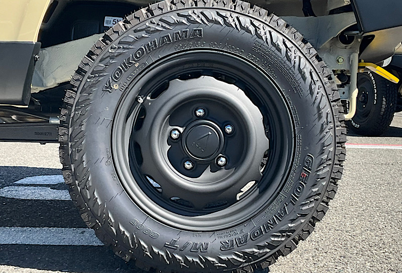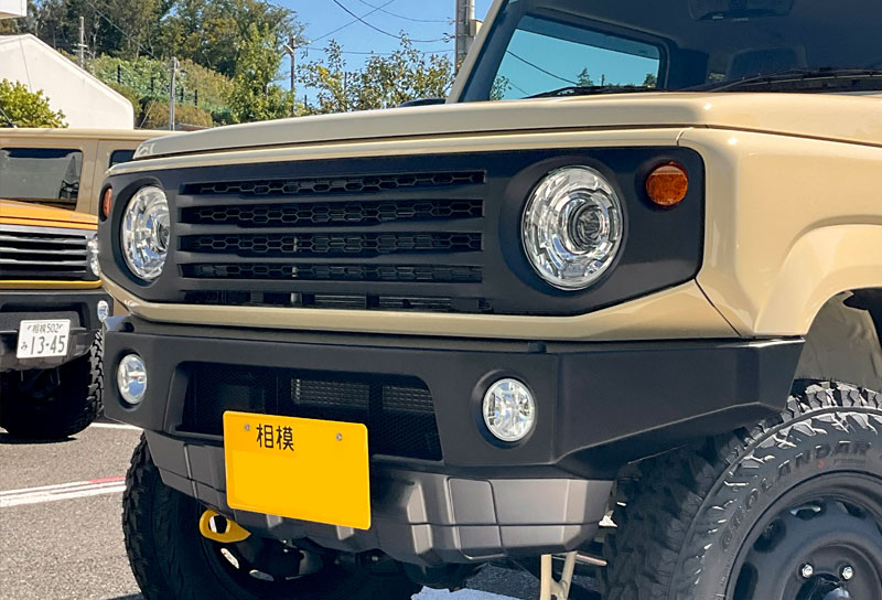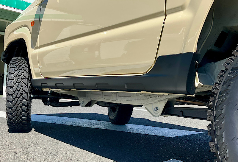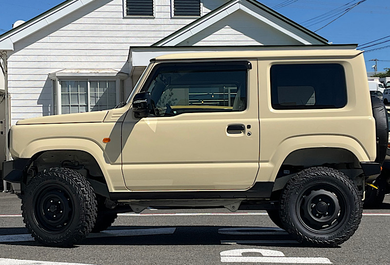 ⅯさんのジムニーはシフォンアイボリーメタリックのボディカラーにワイルドボアVentura&ジオランダーMT195R16C、フロントはタクティカルフロントグリルを装備。その他、純正オプションのサイドアンダーガーニッシュ、未塗装樹脂ドアハンドル等で黒色のパーツを増やすことでディティール感が向上しております。