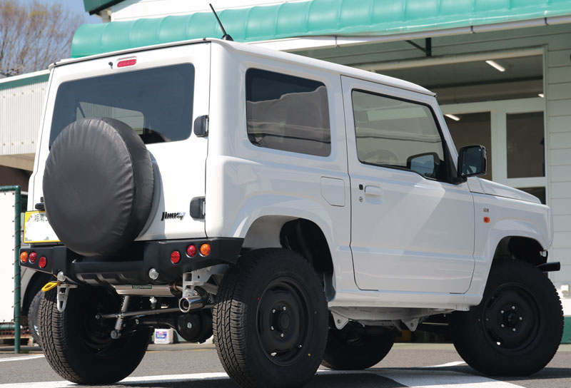 M.GさんのジムニーはXシンプルなホワイトのボディカラーに一番人気のホイールワイルドボアSRアイアンブラックを装着。