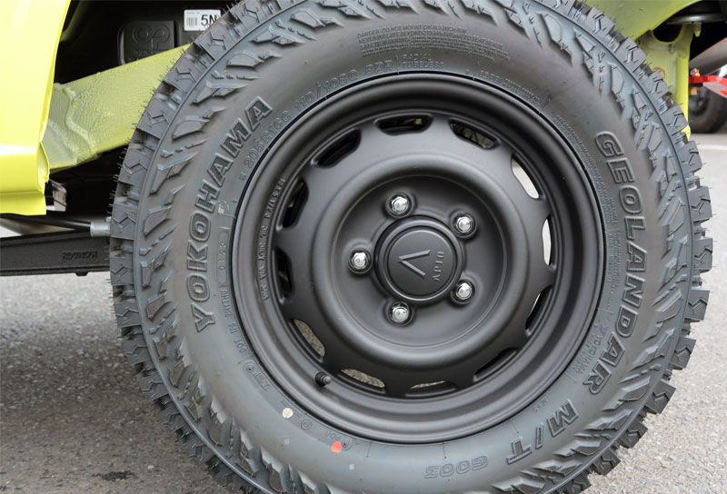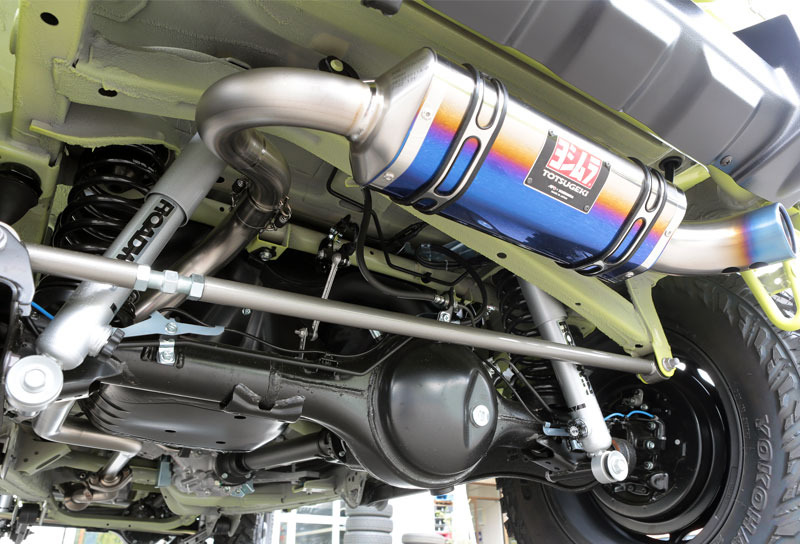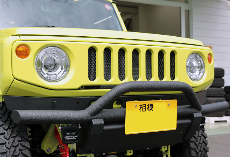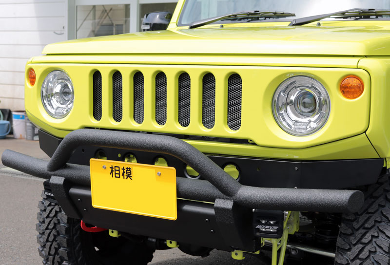 N様さん:ボディと同色のSJグリル・LINE-X仕上げのしし狩りバンパー&黒仕上げのスキッドプレート・チタンブルーのヨシムラマフラー・205サイズのジオランダーMT&ベンチュラホイール等々です。