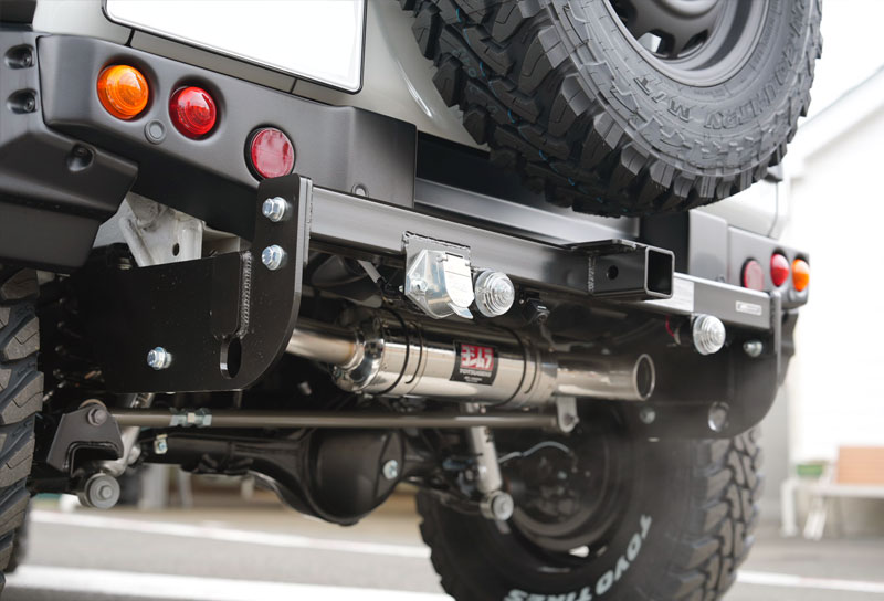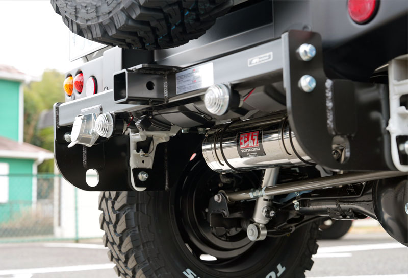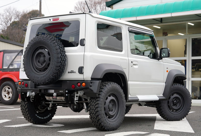 NKさんのジムニーシエラは、マリーナでのボート牽引車両としてご購入頂きました。パールホワイトのボディカラーにワイルドボアベンチュラ16インチシエラ用&「TOYOタイヤ オープンカントリーMT 225/75R16」を装備。また、フロントグリルには定番のタクティカルグリルをチョイス。リアにはアピオタクティカルバンパー用に専用設計したヒッチメンバーを装備し牽引能力を高めています。そしてヒッチメンバーの奥にはヨシムラステンレスマフラーが鎮座し、業務効率爆上がり間違いなし!?
