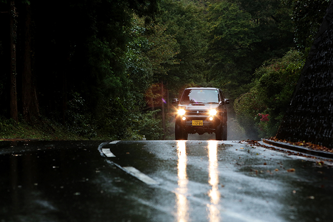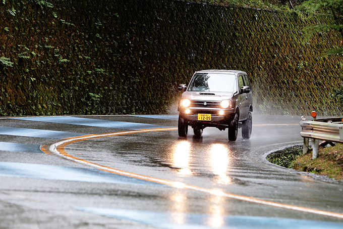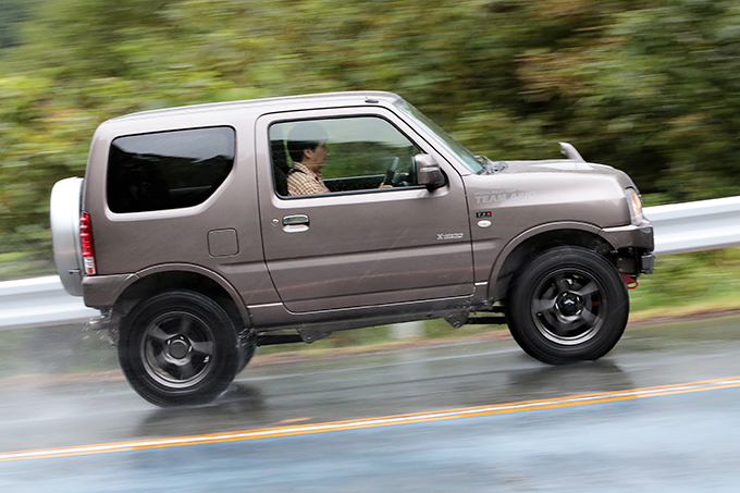 まずはすべてのJB23Wオーナーが乗るシチュエーションであろう、オンロードを試してみる。試乗車には、APIOのオリジナルサスペンション「A2000Ti つよし君 RE50コンプリートキット」として装着。約60㎜アップのコイルスプリング、解除可能式スタビライザー“悟空”などが同時装着されている。ちなみに今回のRE50に組み合わせるスプリングは、このA2000Tiが専用となっている。またタイヤは、ジオランダーM/T+185/85R16。エア圧は1.5kg/m2に設定したが、オンロードではもう少し高く、LT規格サイズでもあるので、2.0kg/m2くらいでもいいかもしれない。
