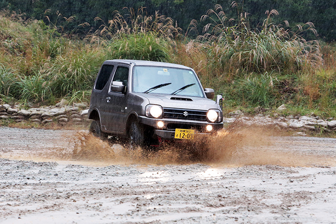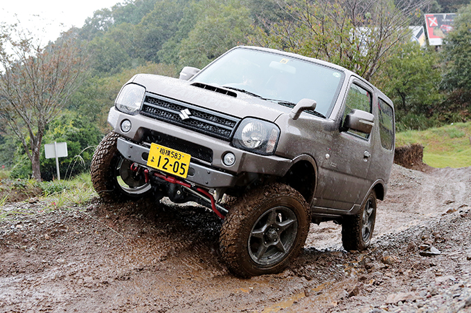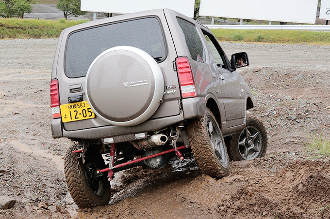 大きなコブの続くシーンでは、やはりストローク量が大きく、とても走りやすい。タイヤが対角線に浮いてからはドライバーのカラダを使って車体を揺すったり(これができるのが軽量ジムニーのいいところ!)、トランスミッションを前進、リバースと素早く切り替える、いわゆる“もみだし”によって、少しでもタイヤにグリップが伝わると、なんとか動き出してくれる。が、コブを斜めに通過していくようなシーンでは、タイヤが滑り出し、挙動が不安定になることも……。