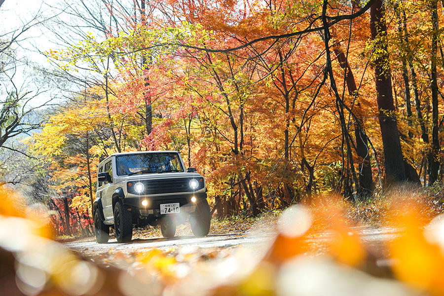 ナローのJB74で走りだすと、昨日は暗くて見過ごしていた暖色に色づいた葉が、そこここで「私はここにいるよ」とでも言わんばかりに光を纏い明媚に揺れている。
