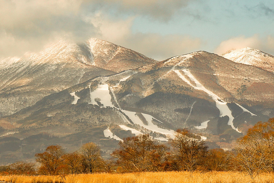 銀嶺に輝く磐梯山を背に