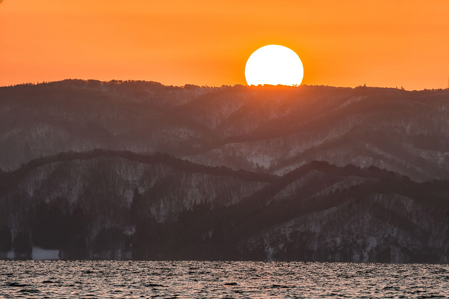 野営予定である猪苗代湖畔のキャンプ場は広く、四駆なら水際まで行ける。雪は無く、むき出しの砂浜の向こうには大きな湖が見えた。雪に埋もれた場所でキャンプしたかったので、野営は林間部の雪のある場所へ移動することにして、しばし気持ちの良い波打ち際で夕暮れを待った。 到着したころに吹いていた強い風は少しづつ和らぎ、湖面には夕陽の赤色と金色が映り込んでいる。 背後にそびえる磐梯山は、暖色に染まっていく。ゆっくりと落ちていく美しい夕陽を、ポケットに手を入れたまま時間を忘れてずっと眺めていた。