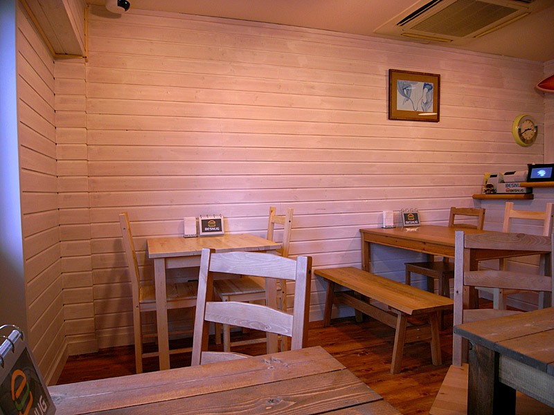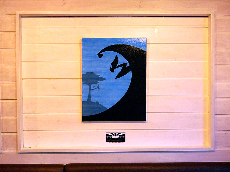 店は6年前、2007年にオープンした。が、その経緯が変わっている。 柏原さんはさらにもう一つ、新聞の販売店を経営している。その新聞代金の「支払い窓口」を兼ねて当初ここに雑貨屋を営業していたが、どうせやるなら趣味と実益を兼ねた飲食店にしようと、長年の夢だったハンバーガーショップに改装した。 テーマは海。ハワイやカリフォルニアの海の傍によくある、一本道の道端にぽつんと一軒だけ在る小さな店――そんなイメージだと柏原さん。白塗りの壁に木の椅子机。こじんまりとした田舎風な造り。装飾の少ない店内にぽつんと掛かる油彩画は、サーフ・アーティストMie Ishii氏の作品。シャッターにもIshii氏の絵が描かれているのだが、これは営業中には当然見ることが出来ない。