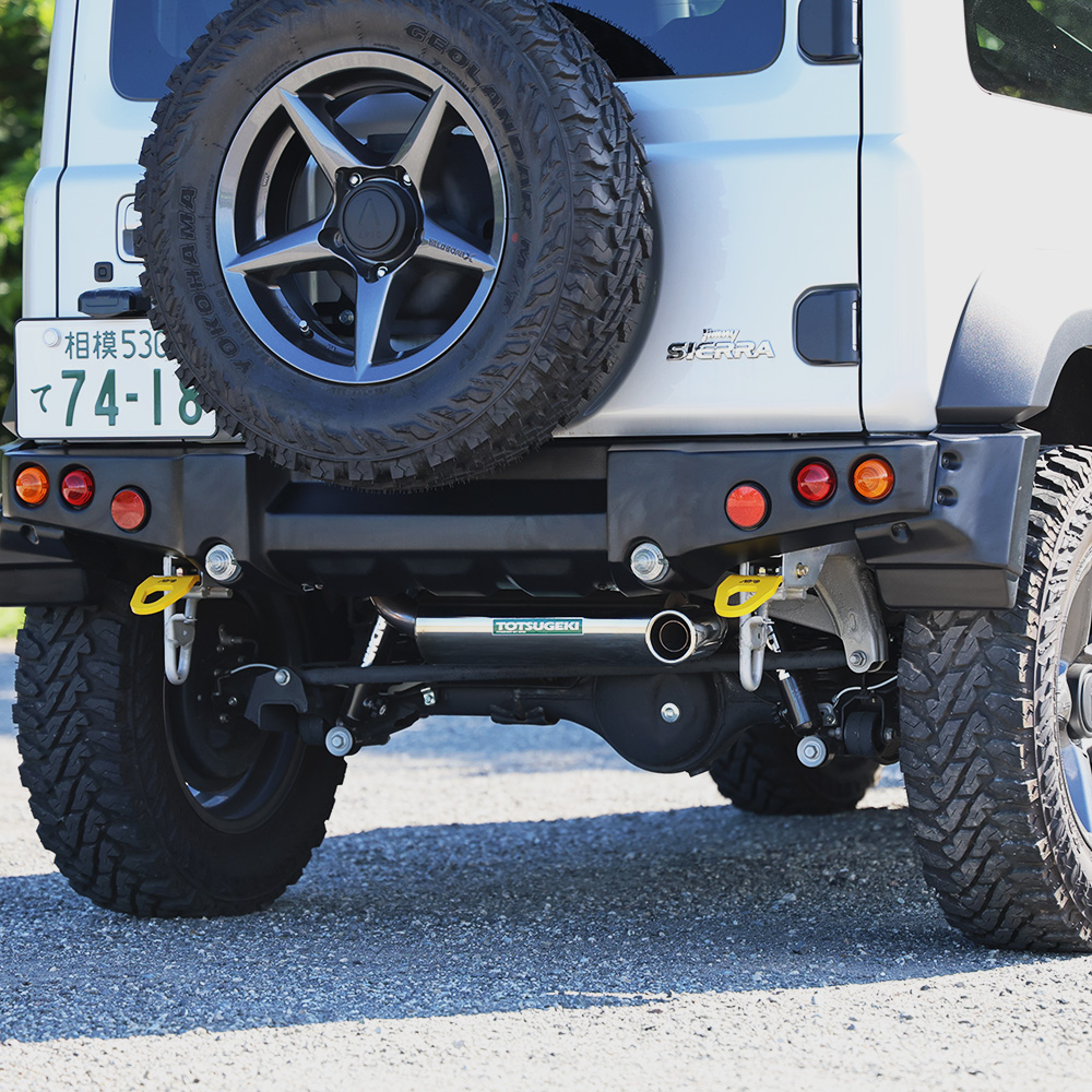 ジムニーJB74のタクティカルリアバンパー(3032-71B/3032-71)にマッチする静香御前マフラー。人気の静香御前マフラーにタクティカルバンパー専用設定が登場!