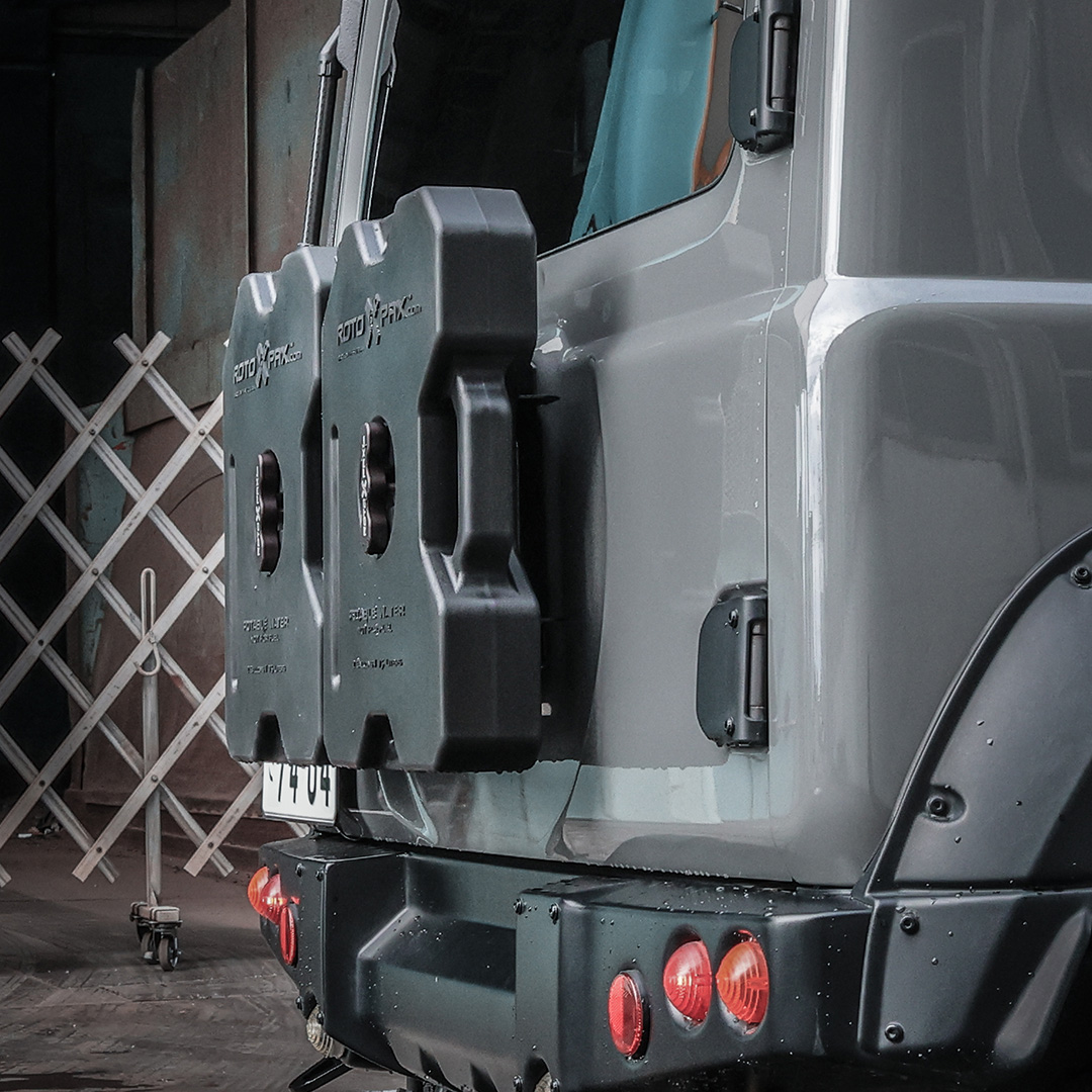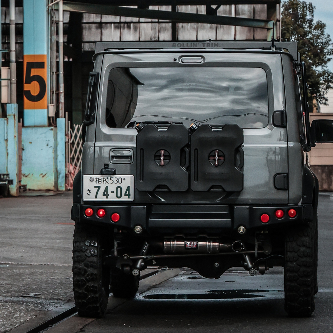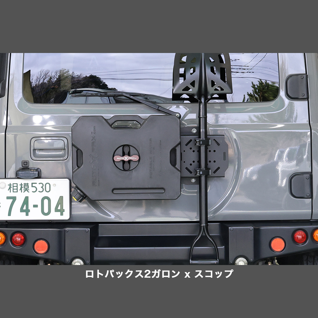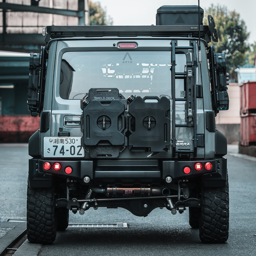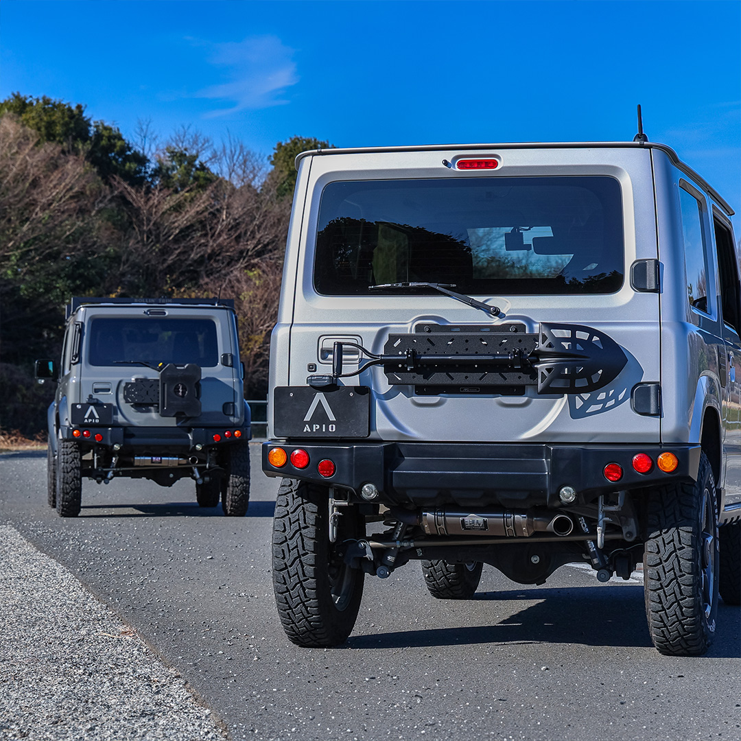 アピオ製リアタクティカルバンパー、スチールリアラダーとの併用も可能ですが、携行物のサイズにより干渉する場合もありますのでご注意ください。