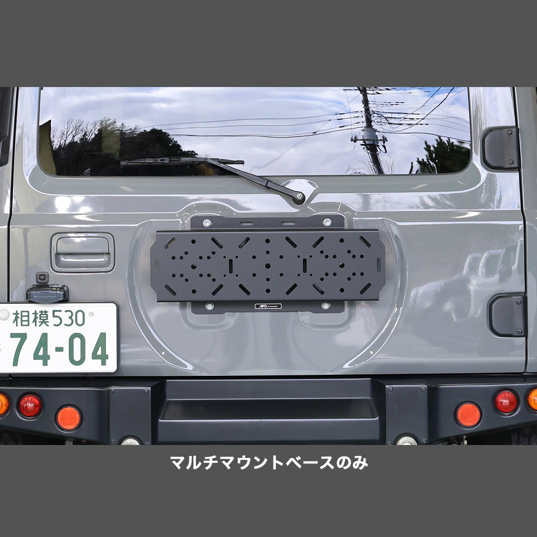 キャリア部品となるマルチマウントベース本体の奥行きを、ジムニーJB64のスペアタイヤブラケットの奥行き以下に設計しているので軽自動車の車検にも対応いたします。