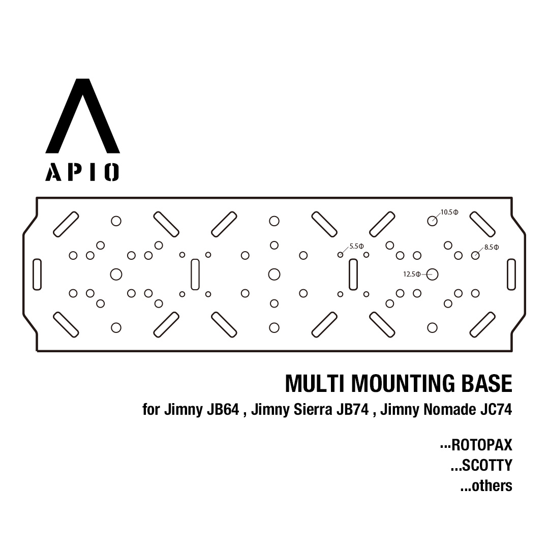 ロトパックスのマウントに加え、12mm, 10mm, 8mm, 5mmのボルトに対応したホールを多才に設け、ユーザーのカスタマイズで多様なアイテムをマウントすることができます。