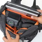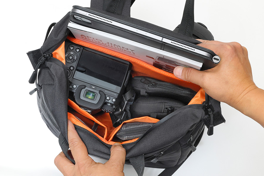 秀逸な内部レイアウトで、カメラ、レンズ、タブレットなど周辺部品も含めてこのひとつで携行可能です。もちろんカメラバッグとしてだけではなく、ビジネスやレジャーシーンでも活躍してくれるデザインです。