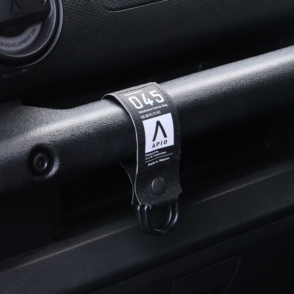 パンツのベルトに通して使うことができます。またジムニーのアシストグリップにも巻き付けられるサイズなので車内のパーツとしてもお楽しみいただけます。(ウェビンググリップカバーの上から併用可)
