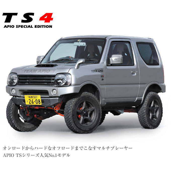 スズキジムニーJB23をベースにしたアピオコンプリートカーTSシリーズで最も多く販売されているのがTS4。ジムニーを知りつくしたアピオだからできるスタイルと性能。10年後も後悔しない車がここにある。