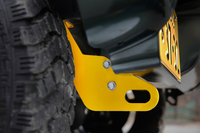 純正バンパーに対応したフロント牽引フック。通常は右用を装着(左に変更も可能)。