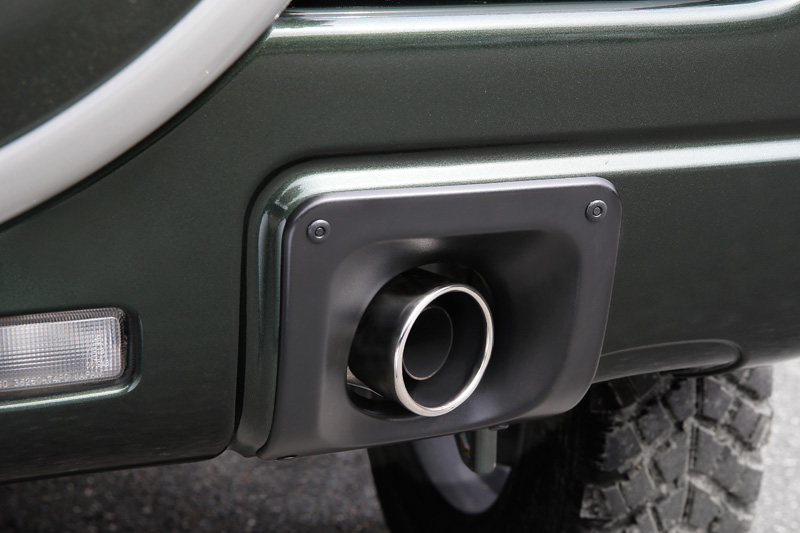 スズキジムニーJB23純正リアバンパーに 「静香御前マフラー」を装着する為のABS樹脂製のガーニッシュ。マフラーカッター無しで排気をバンパーの外側に排出できます。