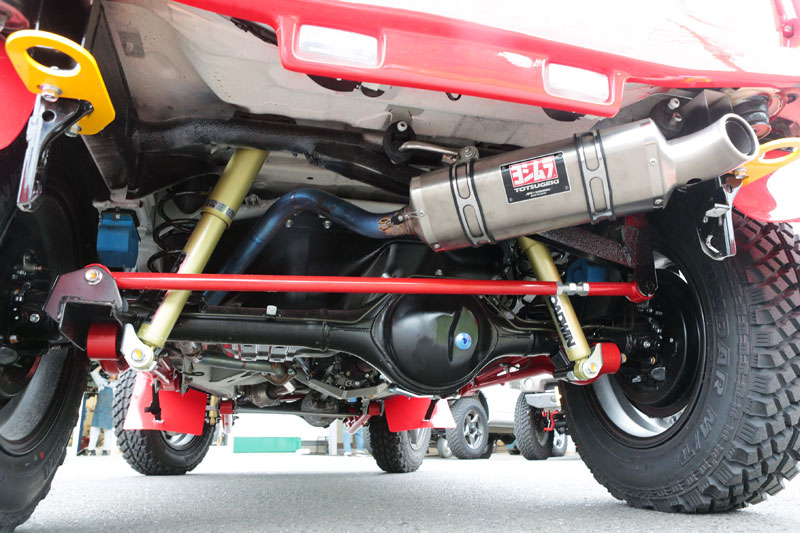 サスペンションはラリー仕様にセッティングされたROADWINラリーレイドサスペンションキット。45mmUPのA2000Tiコイルスプリングに合わせたショックアブソーバーは熱ダレを大幅に軽減する単筒式構造となっている。