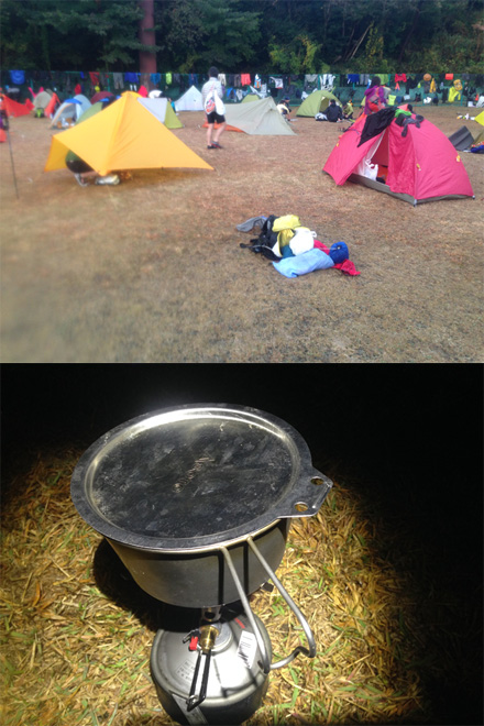上:ここが1日目のキャンプ地。到着したチームからテントを張ってくつろぎます。疲れた身体を癒すもよし。宴会するもよし。<br><br>下:シングルストーブも食事も自分で背負って走らなくてはならないので、できるだけ軽いインスタントラーメンであるチキンラーメンを作りました。