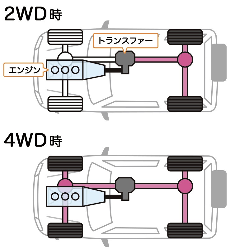 上が2WDの状態。エンジンからの回転力(駆動力)は、トランスファーに入って後輪に行く。下はトランスファーを4WDにした時で、トランスファーのギヤによって前輪に駆動力が前輪にも配分され、四輪が駆動する。さてハナシを元に戻しましょう。2WDから4WDの切り替えは4WDスイッチを長押しして行いますが、これは停止状態でなくてもOKです。意外と知られていませんが、100km/h以下で直進状態であれば、走りながら2WD↔4WDに切り替えることができます。 例えば、高速道路を走行中にいきなりの大雨が降ってきて車両の挙動が不安定…とか、冬道を走ってきたら急に路面が積雪があった…などのシチュエーションで便利です。これは2WD時と4WD時がトランスファー内部で、ギア比が1:1の等速ジョイントで接続されるからです。これはマニュアル式のトランスファーレバーでも一緒です。 ただし、コーナーを走行している時や、雪などでタイヤが空転している最中に4WDに切り替えると、メカを壊す恐れがあるのでやめてください。 2WDに戻すのは一旦停止して、2WDボタンを長押しする必要があります。また、乾燥した路面で4WDに切り替えるのはNGです(理由は次項にて説明)。 さらに、4WD-L(ロー)に入れる場合は、停止状態、しかも車体が平らな場所にいるという条件が必要です。5型以前のJB23型ジムニー(マニュアルトランスファー)は、坂道や斜面などでも4WD-Lにシフトチェンジすることができましたが、スイッチ式になってからはセンサーが働いて平らな場所でないとシフトチェンジできなくなくなってしまいました。 なおスイッチ式であれば、2WDから直接4WD-Lにシフトチェンジすることができます。4WD-Lに入れる場合は、4WDに変えるのと違う操作が必要です。AT車の場合はATセレクターレバーをNに、マニュアルミッション車の場合はクラッチペダルを完全に踏み込まないとシフトチェンジできません。 またトランスファーを操作する場合は、必ずエンジンを始動させて行ってください。エンジン始動させないでボタン操作をすると、メーター内の4WDインジケーターが点滅の状態になります。この場合は、トランスファーは動いていません。この状態でエンジンを始動させ、インジケーターが点灯状態になったらトランスファーが作動しています。