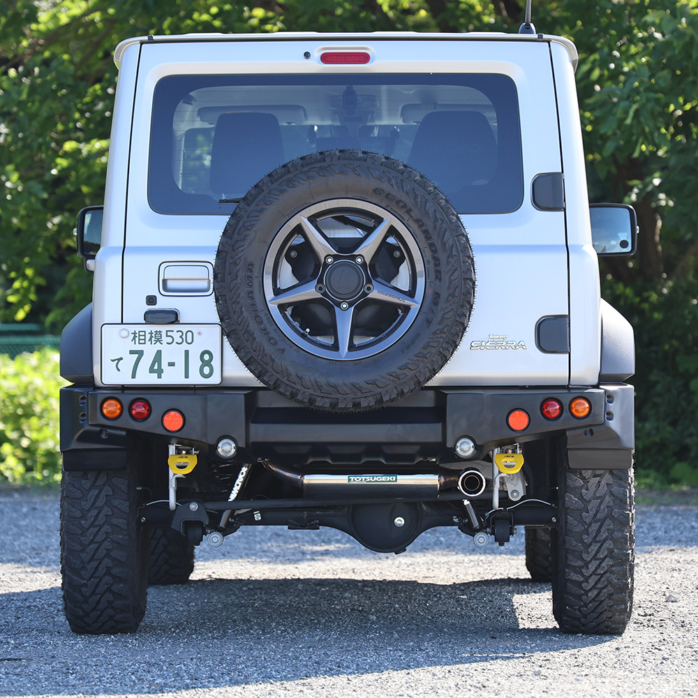 ジムニーJB74のタクティカルリアバンパー(3032-71B/3032-71)にマッチする静香御前マフラー。人気の静香御前マフラーにタクティカルバンパー専用設定が登場!