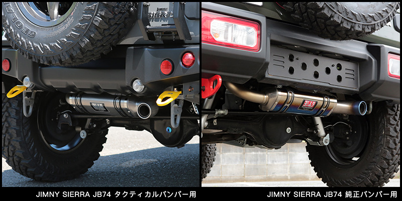 ジムニーシエラJB74の純正バンパー用と、アピオ製タクティカルリアバンパー用の2種類をご用意。どちらのタイプも出口だけではなくヨシムラの美しいサイレンサーをバンパー下からさり気なく主張します。オフロードでのクリアランスの犠牲を最小限に抑えながら美しいヨシムラのサイレンサーを見せることができる絶妙な取り回しです。