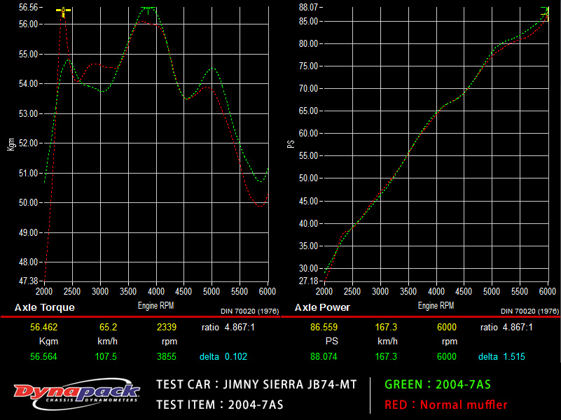 バイナパックパワーテスターではパワーピーク値で1.51PSアップ。トルクはまず発進時の2,000回転までが純正に比べ高く発進時に余裕が持てます。また、中回転域の3,500回転以降からは純正値以上のトルクが得られストレスの少ないドライビングをお楽しみいただけます。