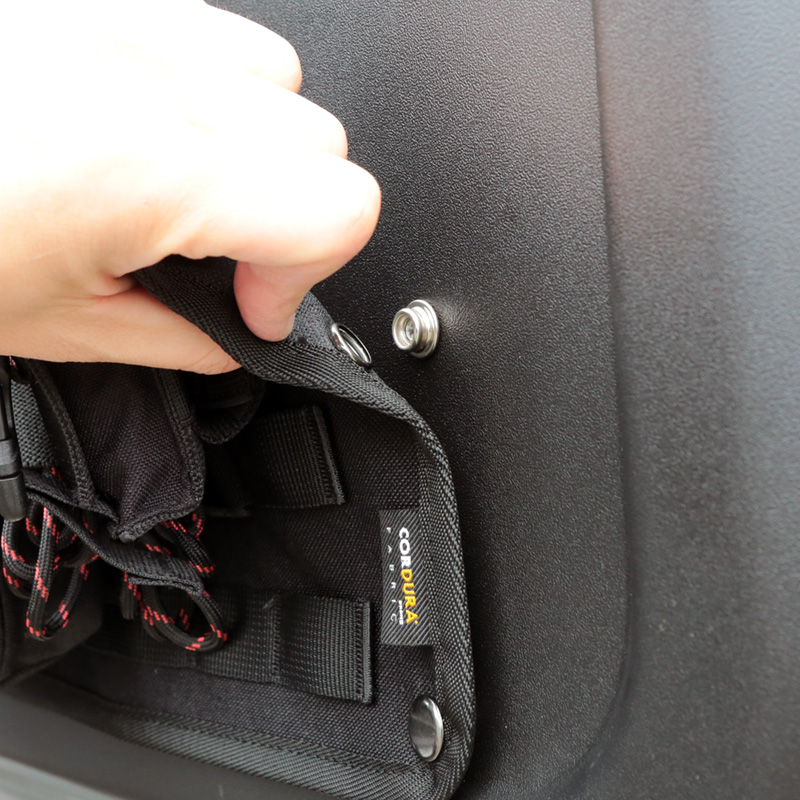 内張にスナップを打ち込み、モールシートと車体はスナップでの固定となるので着脱が用意。荷室に大きい荷物を載せるのにモールシートやポーチが邪魔ならパッと取り外しが可能です。