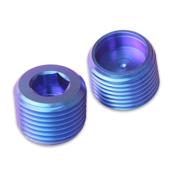 仕上げは陽極酸化処理によるもので、酸化皮膜がブルーに発色したものです。この方法は素材に電流を流して処理を行いますが、表面のみを酸化させるため、ボルト自体の強度を損なうことなくチタン独自の美しい色が表現されています。